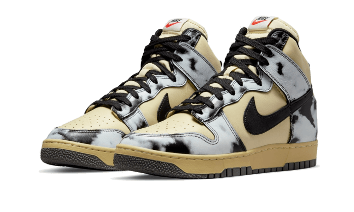 Il Nike Dunk High 1985 Black Acid Wash ha una base in pelle colorata avorio. Poi notiamo alcuni sovrapposizioni lavato con acidoDettagli neri come i lacci e lo swoosh laterale. Branding retro sulla lingua, cos come una suola ingiallito e una suola grigia, completano il design di Peter Moore.