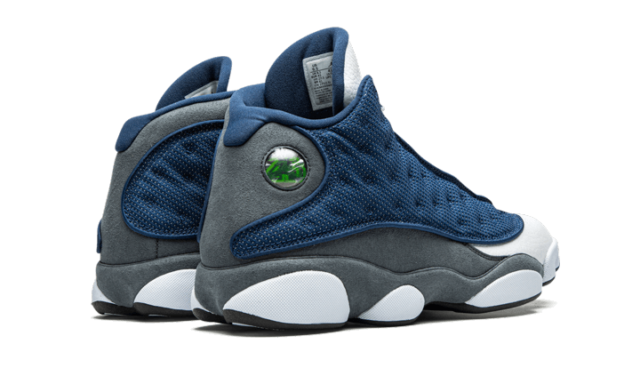 La Air Jordan 13 Retro Flint (2020) est composĂ©e d’un upper majoritairement composĂ© de maille bleu denim laissant apparaĂ®tre un revĂŞtement rĂ©flĂ©chissant. La toebox et la languette en cuir blanc apportent du contraste pendant qu’un empiècement en suede gris partant du talon et allant jusqu’au au garde-boue, apporte de la structure au design. Le tout est finalisĂ© par un Jumpman bleu ciel au niveau de la languette, l’incontournable hologramme sur les cĂ´tĂ©s extĂ©rieurs et des mini languettes Ă la base des lacets avec l’inscription «Jordan» en lettres capitales.