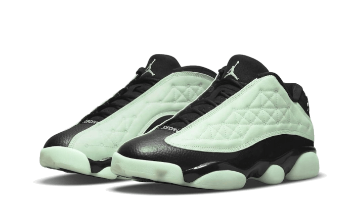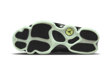 La Air Jordan 13 Low Singles’ Day présente une base en cuir grainé noir matelassé vert clair qui affiche un quadrillage géométrique. Ce dernier se pare d’inscriptions Glow In The Dark au style binaire qui s’accordent avec la semelle noire et vert phosphorescent. Une semelle intérieure aux motifs rappelant les puces électroniques vient parachever le design de Tinker Hatfield.