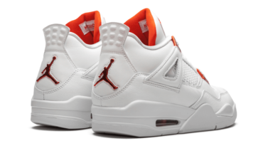 Là Air Jordan 4 Retro Metallico orange opta per una tomaia in pelle Premium Bianco, andando perfettamente con la suola e i lacci. Ci sono una distinzione dalle coppie pawled, specifiche per le edizioni di Air Jordan 4. IL design è completato da elementi orange metallici come occhielli o loghi Jordan Sulla lingua e sul tallone.