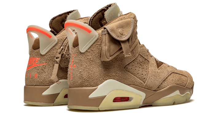There Air Jordan 6 Retro Travis Scott British Khaki is adorned with an upper in suede khaki premium, enhanced by red reminders Infrared And breaks on the brandings or the sole. We find a pocket at the collar, an outsole icy as well as a branding Jumpman On the tongue.
