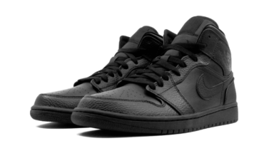 L Air Jordan 1 Mid Triple Black Visualizza una base in pelle nero, Accompagnato da pannelli di pelle tonnellata di tonnellate negli occhielli e nel parafango. Troviamo un Jumpman cos come un logo Jordan Ali nero completando l’iterazione.