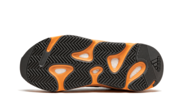 L’Adidas Yeezy 700 Orange Wash ritorna con una base grigia con inserti in camoscio nero e mesh blu-verde. La suola Orange Wash con accenti ovali dello stesso colore contrasta con la suola nera.